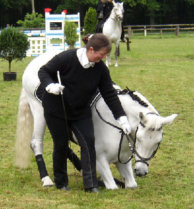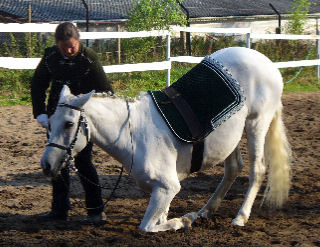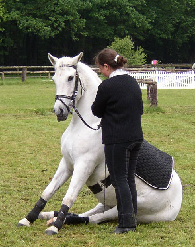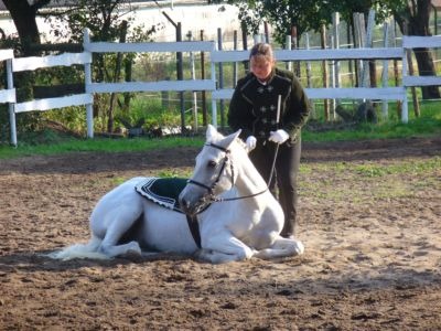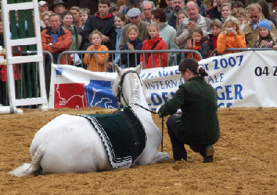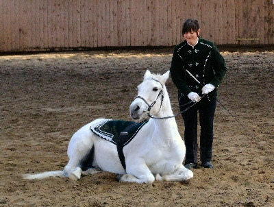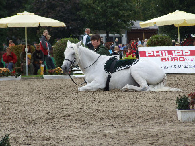Wie alle zirzensischen Lektionen beherrscht Tina auch das Liegen beidhändig. Besonders deutlich wird auf diesem Foto die Gelassenheit mit der sie sich ablegt. Die Aufnahme entstand wärend eines Turnieres für offene Reitweisen in Elferdingen im April 07.