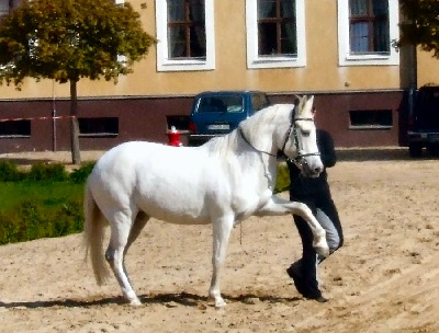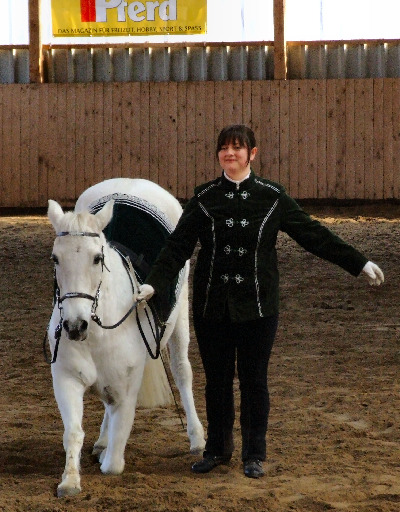 Tina hier im Kopliment. Die Aufnahme entstand auf den Barockpferde-tagen in Elferdingen im April 07. Dieses Kompliment ist einfach nur schön und in absolut perfekter Haltung. Der Zügel ist lediglich aus dem Grund angenommen, damit Tina nicht versehentlich in ihn hereintritt.