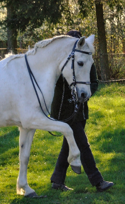 Die Gerte touchiert das rechte Bein. Tina reagiert sofort und nimmt es hoch. Auf diesem Bild kann man erkennen, wie sie die Hinterbeine bereits umsetzt...