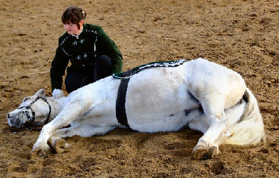Nur wenn das Mensch- Pferd- Verhältnis 100% stimmt, wird sich das Pferd in jeder Situation beim flachliegen entspannen. Tina genießt es sichtlich, sich auch während einer Show flach hinzulegen und mich als "Chef" auf sie aufpassen zu lassen. Sie vertraut mir in diesem Moment als Fluchttier ihr Leben an, denn sie verlässt sich auf mich, dass ich sie in Gefahrensituationen rechtzeitig "warne". Bei Tina geht es sogar soweit, dass sie auch auf Shows die Augen vollständig schließt und richtig tief in sich ruht.